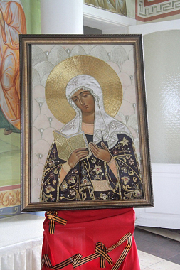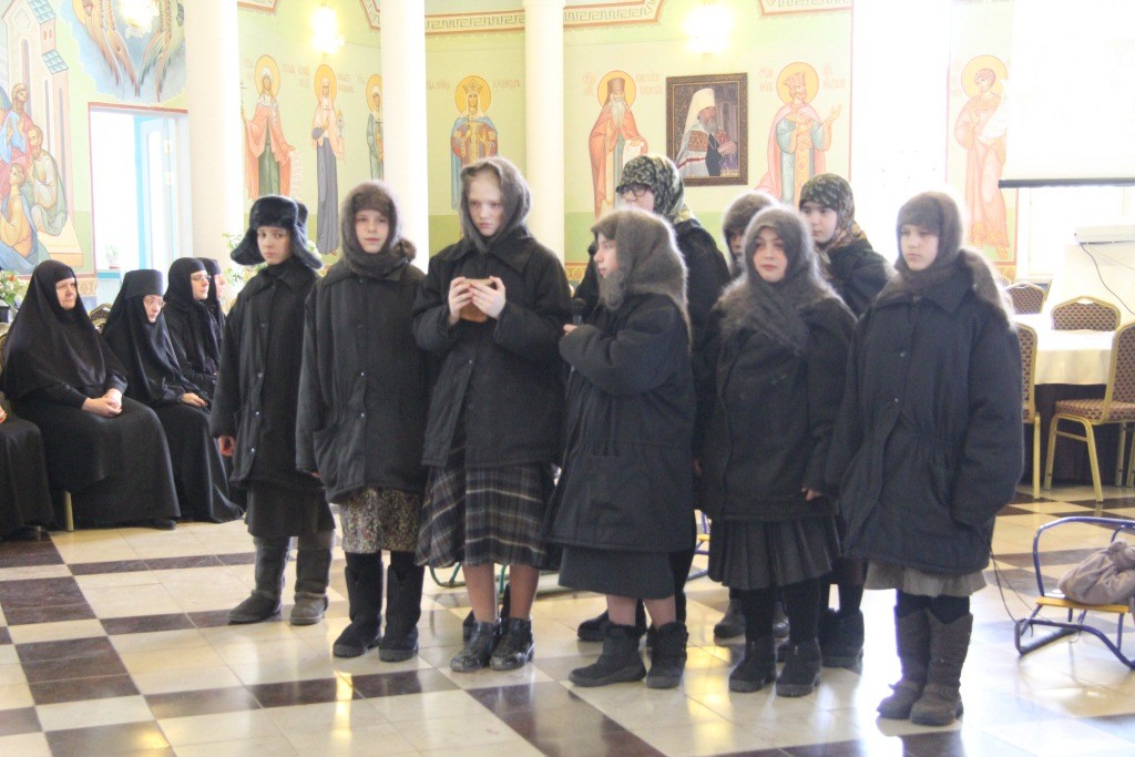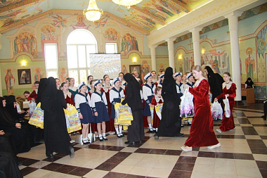 В завершение сестры монастыря преподнесли подарки игумении Николае: цветочные композиции, вышитую сестрами Калужскую икону Божией Матери, оформленный к празднику торт; вручили сладкие подарки воспитанницам детского православного пансиона «Отрада» и сами также получили подарки к празднику.