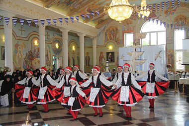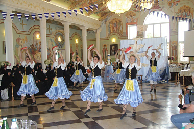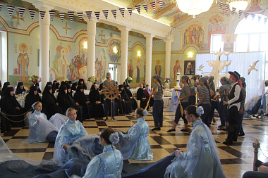Продолжением Божественной литургии стал праздничный обед в большой трапезной обители, куда впервые после длительного периода карантина были приглашены и прихожане обители, посетившие богослужение. Приготовленная с молитвой и любовью трапеза с духовным чтением завершилась концертом-спектаклем, посвященным святителю Николаю, который подготовили участницы хореографического ансамбля «Отрада». Украшенный в морской тематике зал, ставший как бы палубой корабля, направляющегося из Мир Ликийских в Бари, превратился в сцену, на которой разыгрывались сценки из жития святителя Николая. Между этими сценками и рассказами ведущих концерта участницы ансамбля «Отрада» представляли русские и европейские танцы.
