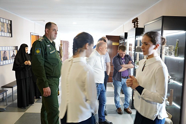 В интерактивном музее экскурсии провели экскурсоводы Анастасия и Кристина Сарвилины, выпускницы пансиона «Отрада», которые воспитывались при монастыре с 3-х лет и сейчас являются студентками 3 и 4 курсов факультета коммуникативного менеджмента Российского государственного социального университета по специальности «журналистика». Девочки показали гостям стенды и витрины музея, рассказывая о духовных основаниях великих побед в Отечественной войне 1812 года и Великой Отечественной войне. Гости с большим интересом осмотрели и галерею героев Малоярославецкого сражения, зал-часовню чудотворных икон, связанных с Малоярославецким сражением: образ Спаса Нерукотворного, написанного на Святых вратах обители, оставшихся единственным уцелевшим строением после вторжения французов, изрешеченных пулями и картечью, но сохранивших невредимый лик Спасителя, и Калужскую икону Божией Матери, по свидетельству пленных французов, являвшейся над полем сражения в Тарутине и Малоярославце.