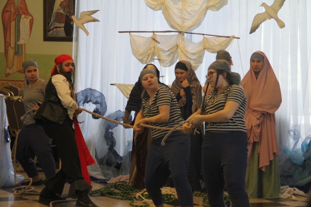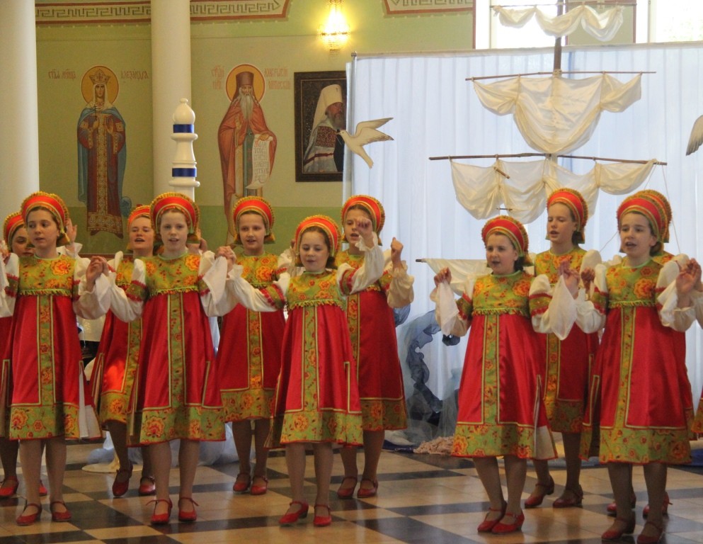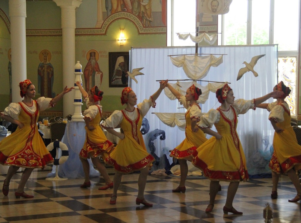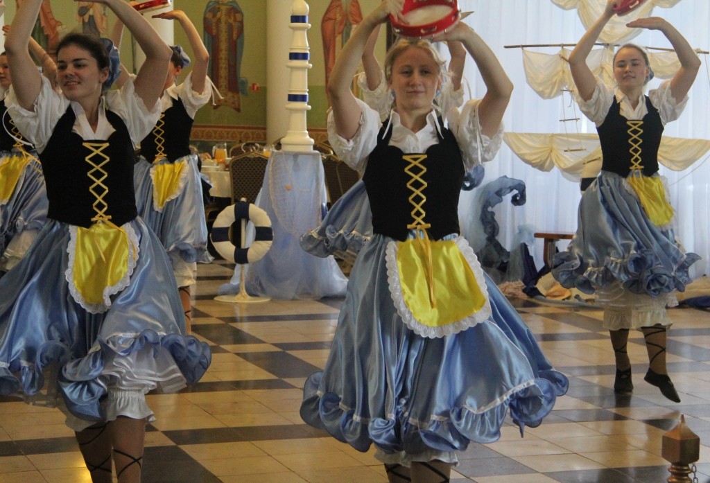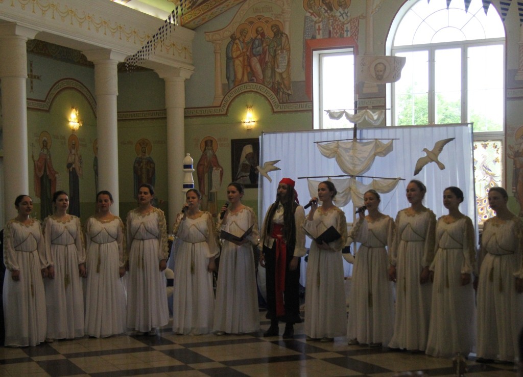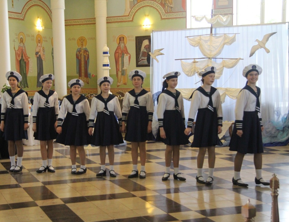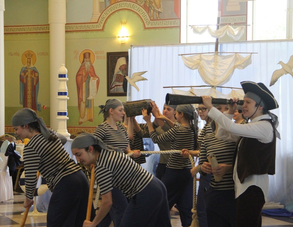 В преображенном, украшенном в морской тематике зале большой трапезной с парусами, флагами, корабельными веревочными лестницами – шторм-трапами, изображениями кораблей, морских глубин был показан концерт, участники которого – матросы корабля, везшего мощи святителя Николая в Бари, пират, который по молитвам святителя спасся из морских глубин и покаялся в своих злодеяниях, – и ведущие концерта-спектакля рассказывали о святителе Николае, его милосердии и чудесах, а между этими рассказами выходили танцевать матросское «яблочко» младшие воспитанницы «Отрады», «проплывал» плавный хоровод «Речка», девочки исполняли русские плясовые «Катеньку», «Ой, вставала я ранешенько…», итальянскую тарантеллу; финский танец представил младший состав «Отрады».