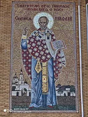 После спектакля матушка Николая обратилась к собравшимся с духовным наставлением. В своем слове игумения Николая сообщила о том, что сестры монастыря, находившиеся на карантине, не теряли времени даром и при том, что много молились, исполняя правило, читая акафисты и Псалтирь, изготовили в подарок жителям и гостям города огромную, в два этажа, мозаику с ростовым изображением святителя Николая, которую уже установили на фасаде здания Духовно-просветительского центра «София». Таким образом, со стен «Софии» святитель Николай, покровитель Малоярославца, благословляет всех, кто проезжает или проходит мимо через центральные улицы города. Планируется с другой стороны фасада в будущем поместить мозаику такого же размера с образом Христа в виде Софии, Премудрости Божией, Которому посвящен Духовно-просветительский центр «София».