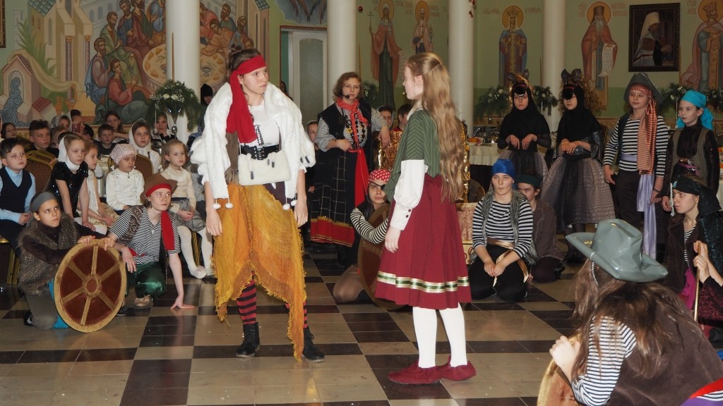 Почти месяц воспитанницы детского православного пансиона «Отрада» готовили этот музыкальный спектакль. С участием насельниц монастыря шили костюмы, готовили декорации и реквизит, световые эффекты и музыкальное сопровождение. Репетировали под руководством режиссера и педагога актерского мастерства из Обнинска Юлии Носовой, уже знакомой старшим воспитанницам пансиона, готовящимся к поступлению по специальности «журналистка», и студенткам Центра православных медиа по урокам дикторского мастерства.