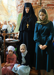 За Божественной литургией вместе с прихожанами молились настоятельница этого монастыря игумения Нина (Антонова) с сестрами обители, представители нижегородского Свято-Георгиевского общества хоругвеносцев.