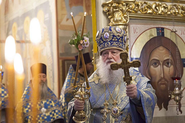 Обращаясь по окончании Литургии к молящимся в храме с напутственным словом, Его Высокопреосвященство поздравил всех с великим двунадесятым праздником.