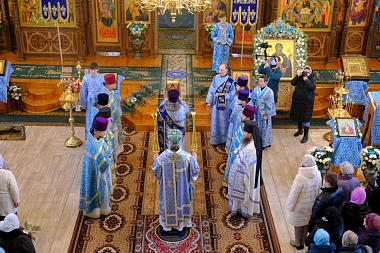 Его Высокопреосвященству сослужили благочинный г. Коврова протоиерей Михаил Чернов, благочинный Ковровского района протоиерей Игорь Любченко, священники г. Коврова, наместник Богородице-Рождественского монастыря г. Владимира игумен Кирилл (Сурков), руководитель службы протокола иерей Иоанн Власов.