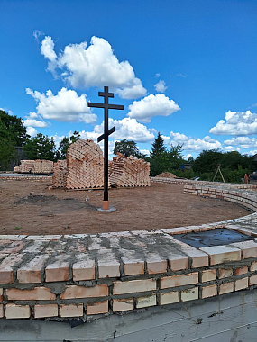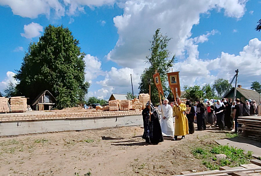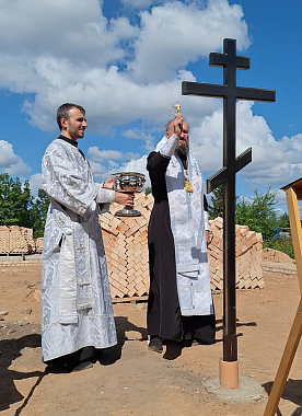 По окончании Божественной литургии архипастырь, священнослужители и молящиеся крестным ходом проследовали к месту строительства будущего храма, где и был совершен чин на его основание.