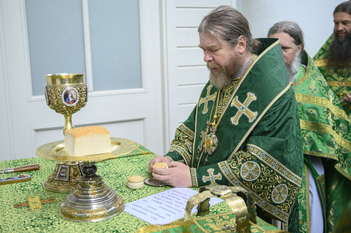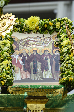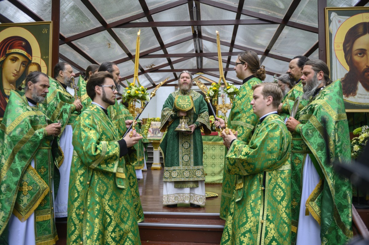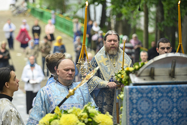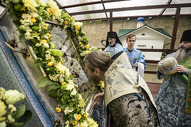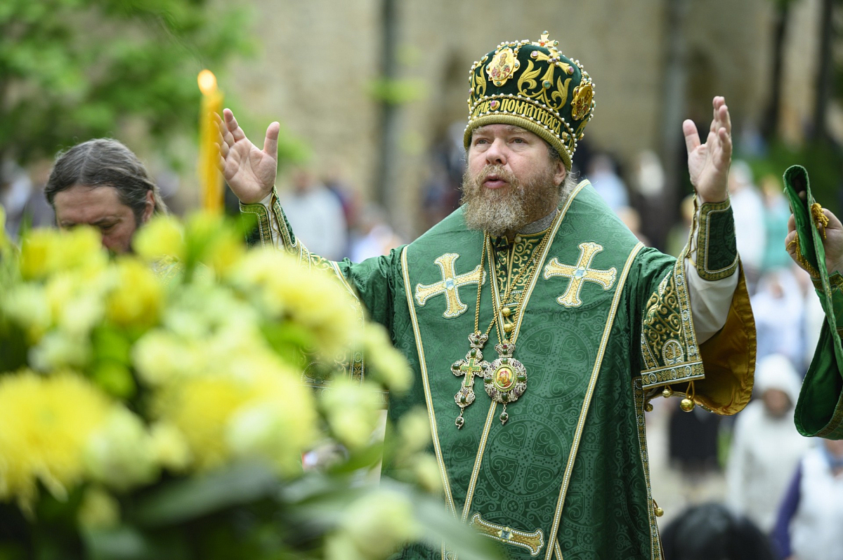 В сам праздничный день за Литургией главе Псковской митрополии сослужили наместник Благовещенской Никандровой пустыни архимандрит Спиридон (Иващенко), исполняющий обязанности наместника Иоанно-Богословского Савво-Крыпецкого монастыря иеромонах Всеволод (Сиканов), благочинный Псково-Печерской обители иеромонах Прохор (Андрейчук) с братией в священном сане.