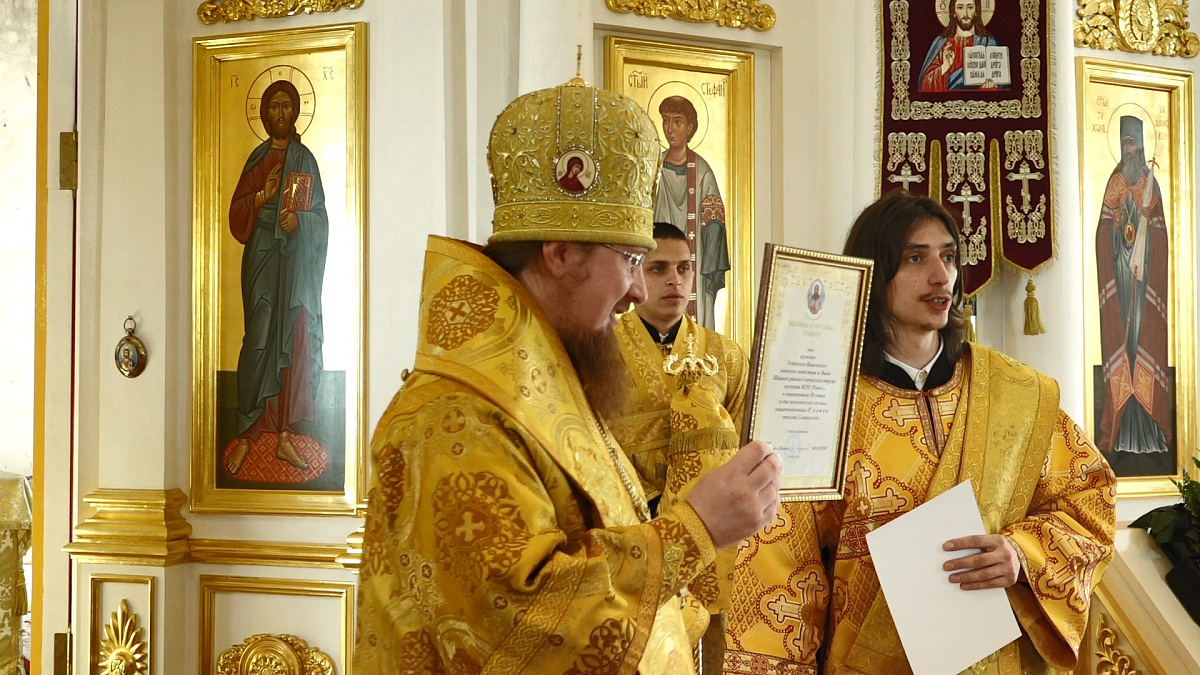 В завершение литургии владыка Феодорит поблагодарил епископа Дионисия и всё духовенство за радость совместного богослужения и вручил Патриаршие и епархиальные награды.