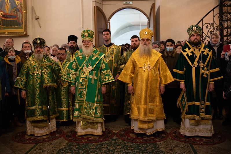 Архиереям сослужило духовенство Новгородской митрополии.