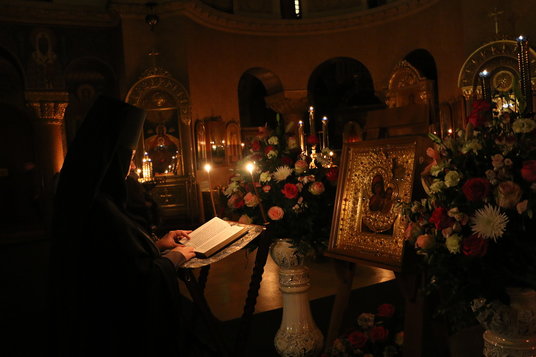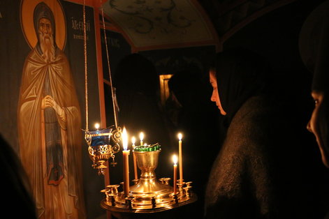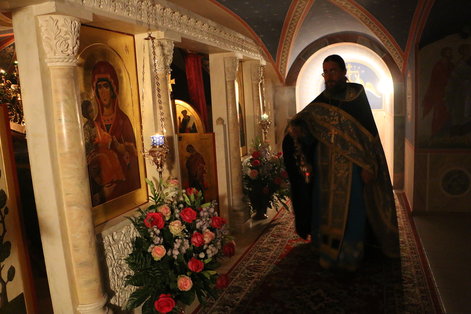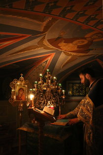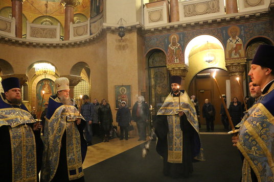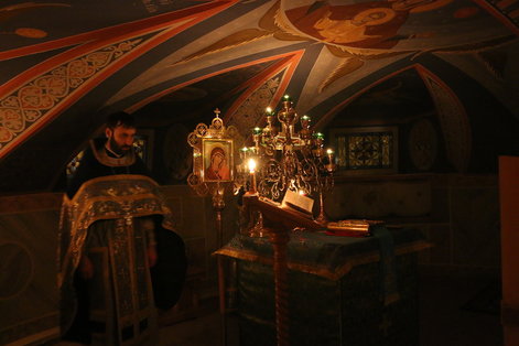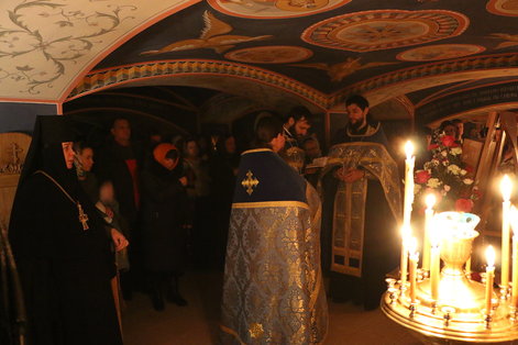 Ночная Божественная литургия была отслужена в крипте храма Преподобного Силуана Афонского (сам храм закрыт на время проведения реставрационных работ).