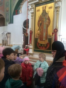 На уроке присутствовали и совсем маленькие пятилетние ученики Воскресной школы. Им рассказывали, как вести себя в храме, как креститься и прикладываться к иконам, святыням.