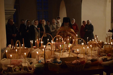 По окончании праздничного богослужения верующие обменялись пасхальными поздравлениями и собрались разговеться в трапезной монастыря.