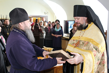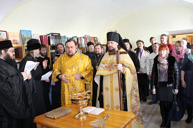 Игумен Марк познакомил гостей с наиболее ценными старинными библиотечными книгами: Требником, напечатанным в 1855 году, Новым Заветом 1904 года издания и многими другими экземплярами. Большой интерес вызвали и рукописные книги советского периода.