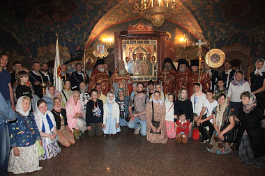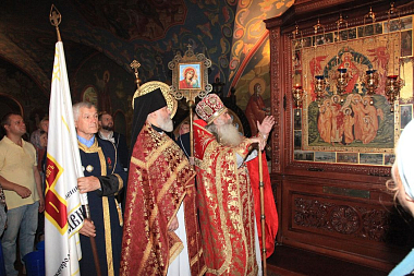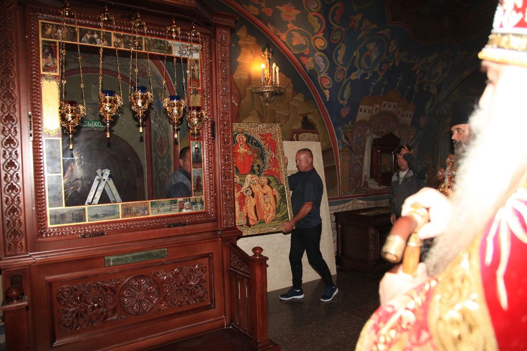 Далее крестный ход проследовал в Успенскую церковь, где для иконы св. Царственных мучеников был устроен резной киот и по заказу Печерского монастыря написана иконописная рама с клеймами повествующими о последнем годе жизни Царской семьи с изображениями отречения от престола, заключения в Царском Селе и Тобольске, передача Романовых Уралсовету, ипатьевского дома, расстрел в ипатьевском доме, а так же с изображениями верных слуг принявших мученическую кончину вместе с Царской Семьей. Возле иконы архимандрит Тихон прочитал молитву и было пропето величание, после которого наместник обители поведал присутствующим в храме богомольцам о создании этой иконы и иконописной рамы, об освящении их на Урале – в Храме на Крови, где стоял Ипатьевский дом, в Поросенковом логу, в монастыре святых Царственных мучеников на Ганиной яме, в Алапаевске, в Верхотурском Николаевском монастыре на мощах святого праведного Симеона Верхотурского чудотворца и многих Уральских святынях.