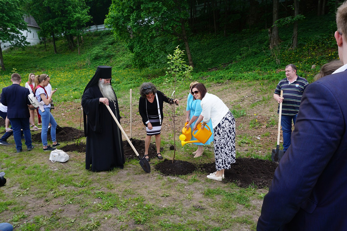 В честь юбилея и было решено высадить деревья на месте исторического парка, где будет увековечена память правителей Русской земли. Игумен Вознесенского Печерского монастыря архимандрит Тихон (Затёкин) совершил молебен перед началом доброго дела.