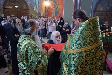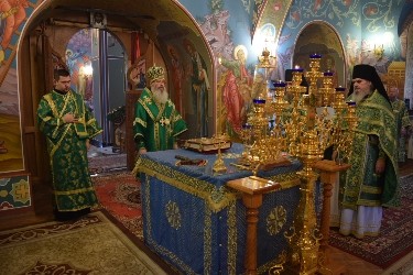 По окончании богослужения владыка окропил молящихся святой водой и поздравил духовенство и паломников с престольным праздником обители.