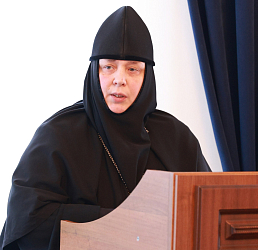 Следующий доклад «Монастырские уставы и формирование личности монашествующего» был сделан настоятельницей Свято-Введенского Толгского женского монастыря игуменией Варварой (Третьяк). Матушка настоятельница обратила внимание слушателей на подвижнические труды святителя Василия Великого, преподобного Феодора Студита и святителя Игнатия (Брянчанинова) и на созданные ими труды «Подвижнические уставы», «Огласительные поучения» и «Приношение современному монашеству».