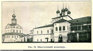 Известно, что Белогостицкий мужской монастырь был основан на левом берегу реки Вёксы в начале XV века архиепископом Ростовским Григорием. Название монастыря связывают с легендой об охоте в этих местах князя Кия, основателя Киева, жившего в белом шатре и прозванного «белым гостем». Особой известности монастырь достиг, когда его архимандритом в 1630–1646 годах стал Иона Сысоевич, впоследствии всесильный митрополит Ростовский. В середине XVII века обитель была обнесена каменной оградой с четырьмя башнями. Основу ансамбля составляли два стоящих рядом храма, построенных в 1657–1658 годах. Самую главную святыню монастыря представляла чудотворная икона Казанской Божией Матери. Эта икона прежде была домовою у князя Михаила Темкина. В Благовещенском соборе Белогостицкого монастыря под церковью находился подклет с пятью каменными гробницами рода князя Ростовского Михаила Темкина, благотворителя этой обители.