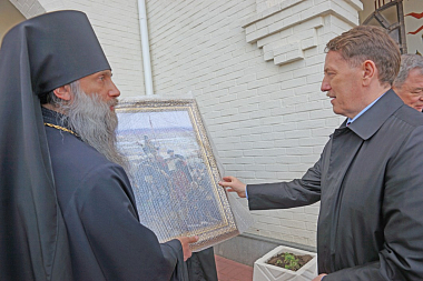 В завершение высоким гостям архимандрит Тихон подарил картины репродукций фрагментов полотна «Великое стояние на Угре 1480 года», календари монастыря и пригласил в будущем всех посетить также и святую обитель.