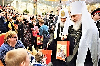 Зрительный зал был заполнен детьми из Москвы и близлежащих регионов, в том числе детьми-инвалидами, многие из которых получили подарки из рук самого Патриарха.
