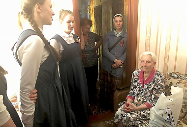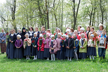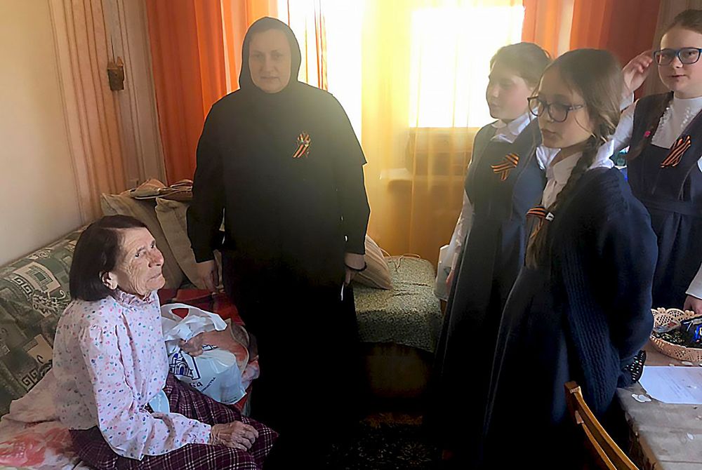 По традиции девочки с насельницами монастыря поздравляют в День Победы ветеранов окрестных деревень, дарят им подарки, поют песни. Престарелых и инвалидов посещают дома. С некоторыми из них воспитанницы школы знакомы не один год, некоторых уже не стало, и девочки поминают их в своих молитвах. Ветераны рассказывают детям о своей жизни в тяжелые военные и послевоенные годы. Все рассказы о том далеком времени глубоко западают в детские души. Так не прерывается связь между поколениями, сохраняется и передается память.
