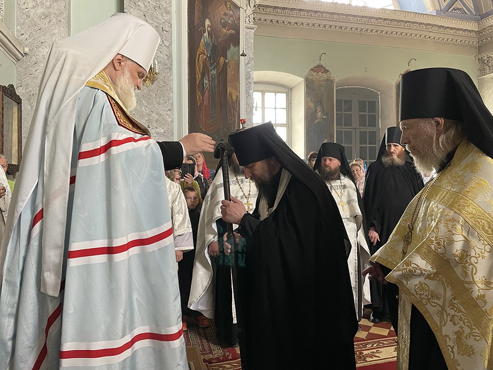 Я вручаю Вам этот посох, который знаменует некую духовную власть над иноками, и хотел бы пожелать, чтобы этот посох был подобен посоху Божию, которым Господь не только исправляет и наказует, но был исполнен любви и помогал в шествии к Богу и спасению и Вам, и всей обители.