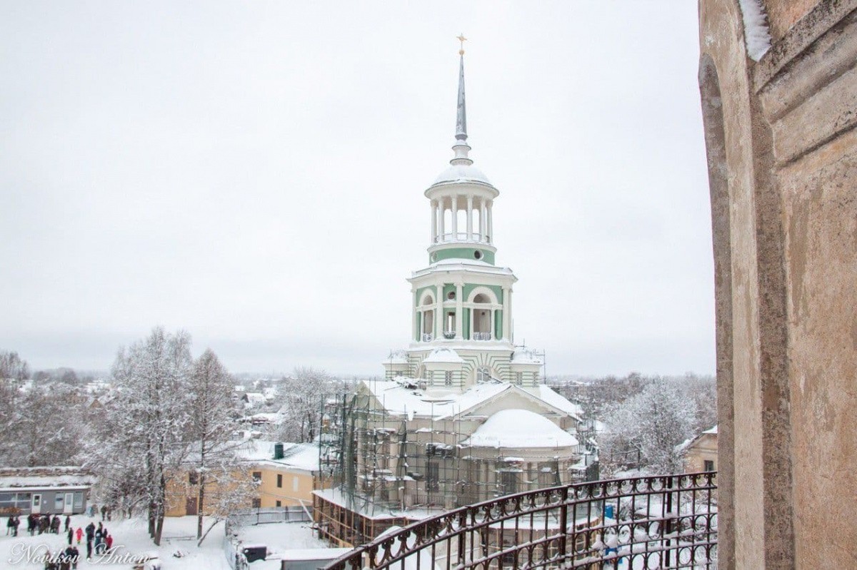 Завершается первый этап реставрационных работ на Надвратной колокольне с церковью Спаса Нерукотворного Образа Новоторжского Борисоглебского мужского монастыря города Торжка Тверской области.