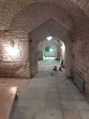 В подклетной части здания уже отреставрированы стены из природного известняка, завершается подводка электросетей, отреставрированы ниши, дверные проемы и арки. Несколько раз проведена антисептическая обработка стен. Работы выполнены с применением «здорового» камня – такой известняк, добытый с помощью вырубки гидравлическим молотом, отличается высокой прочностью. Его везут только из каменоломен Ленинградской области и из Порховского района Псковской области. Это так называемый «Путиловский известняк» – он широко применялся при строительстве Санкт-Петербурга во времена Петра I.
