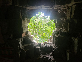 Взору паломниц предстал израненный, местами разрушенный монастырь. Большой белый величественный собор, несмотря на повреждения от обстрелов, продолжает украшать обитель, словно столп, стоящий в центре монастыря. Купола сильно повреждены, в стенах есть пробоины размером с окно. Корпуса все разрушены, часть из них не подлежит восстановлению. Сестры живут в нижнем храме и двух вагончиках.