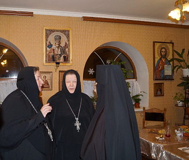 За время посещения архиерейского подворья матушки настоятельницы ознакомились с монашеской жизнью сестер, несущих послушание в Свято-Николаевской социальной обители милосердия Святые пещеры, их богослужебной жизнью, уставом, распорядком дня, послушаниями и условиями жизни.