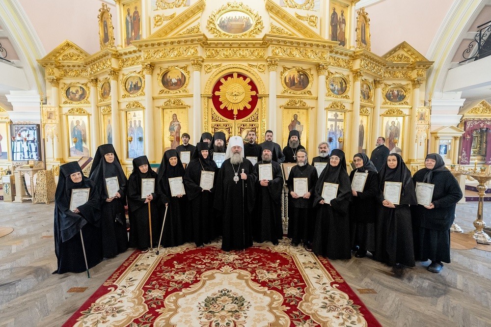 По окончании богослужения правящий архиерей вручил свидетельства выпускникам курсов базовой подготовки в области богословия для монашествующих Русской Православной Церкви.