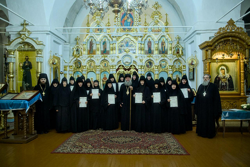 Митрополит Евгений поздравил монашествующих с завершением обучения и поблагодарил за исполнение благословения Святейшего Патриарха Кирилла о том, что «братья, и сестры в монастырях должны знать Православное учение, Писание, должны знакомиться с учениями святых отцов».