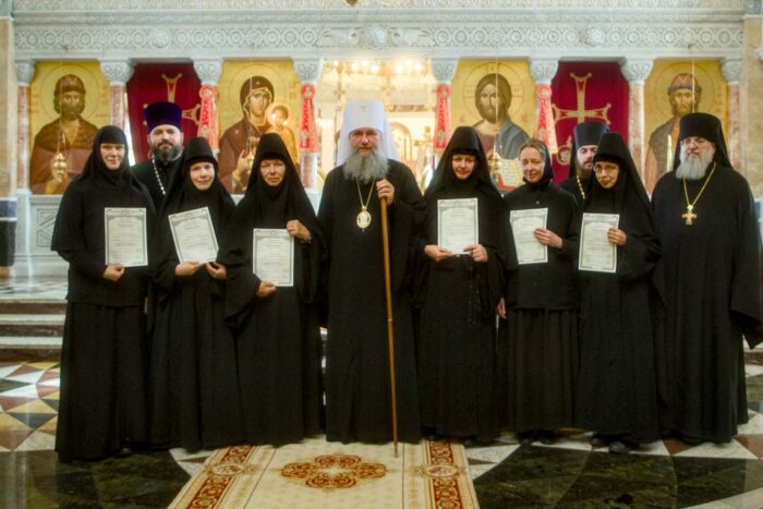 В завершение митрополит Евгений вручил свидетельства о прохождении курсов базовой подготовки для монашествующих настоятельнице Сарсинского Боголюбского женского монастыря игумении Галине (Голомидовой) и сестрам обители.