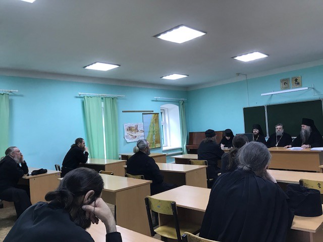 По окончании зачета в Екатеринбургской духовной семинарии состоялась встреча членов выездной экспертной группы с ректором семинарии иеромонахом Корнилием (Зайцевым), а также с преподавателями и руководителем курсов иеромонахом Клавдианом (Меньшиковым). На встрече обсуждались вопросы организации работы курсов и особенности преподавания изучаемых дисциплин монашествующим без священного сана, отличительные моменты в программах в сравнении с одноименными общепринятыми семинарскими.