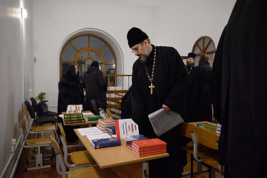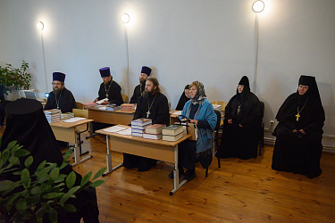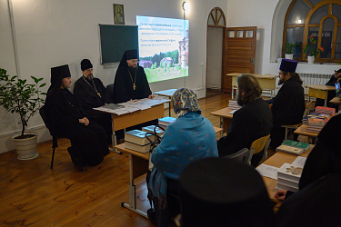 Председатель выездной группы игумен Иоанн (Рубин) изложил собравшимся особенности преподавания дисциплин курсов монашествующим, в целом важность повышения уровня образования насельников и насельниц обителей, а также раскрыл основные темы общецерковных документов, регламентирующих деятельность курсов базовой подготовки в области богословия монашествующих.