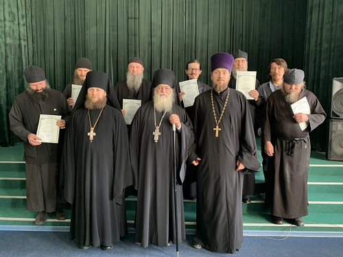 На площадке Свято-Троицкого мужского монастыря г. Алатыря руководитель курсов иерей Илия Лебедев вручал свидетельства совместно с наместником монастыря игуменом Софронием (Дубровиным).