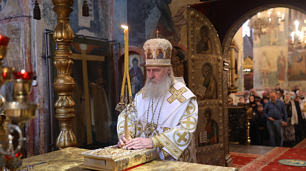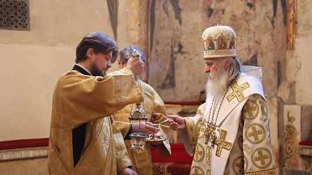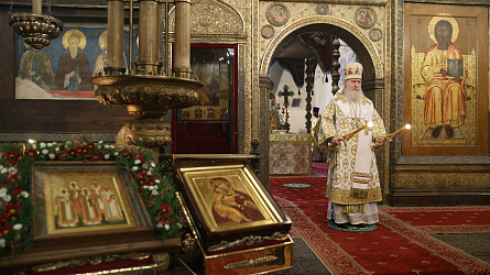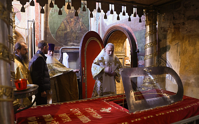 По окончании Литургии было совершено славление святителям Московским. Затем митрополит Феогност поклонился честным мощам святителей Московских, почивающих в Успенском соборе.