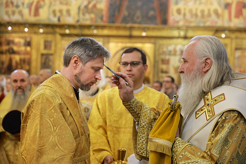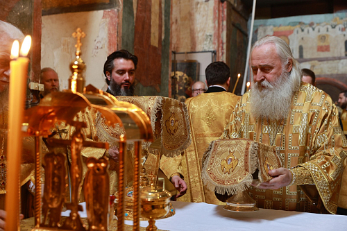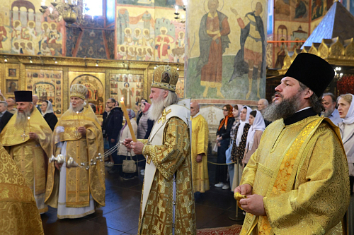 Его Высокопреосвященству сослужили секретарь Патриарха Московского и всея Руси по г. Москве протопресвитер Владимир Диваков, ризничий Патриаршего Успенского собора и храмов Московского Кремля, настоятель Патриаршего подворья храмов в Зарядье г. Москвы протоиерей Вячеслав Шестаков, столичное духовенство.