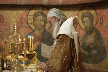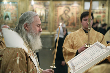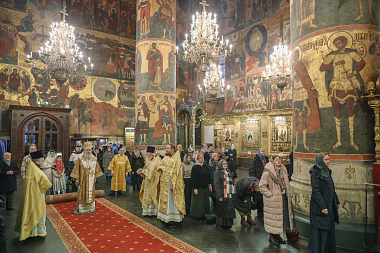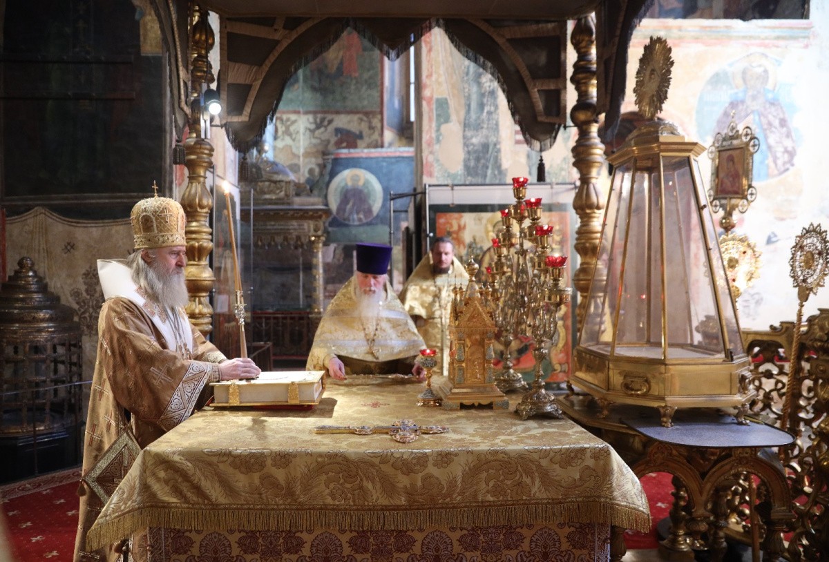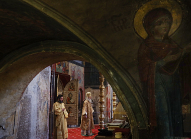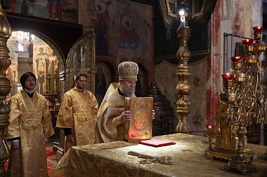 Его Высокопреосвященству сослужили: секретарь Патриарха Московского и всея Руси по г. Москве протопресвитер Владимир Диваков, ризничий Патриаршего Успенского собора и храмов Московского Кремля, настоятель Патриаршего подворья храмов в Зарядье г. Москвы протоиерей Вячеслав Шестаков.