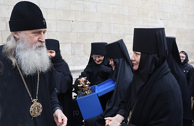 За Литургией молились заместитель председателя Синодального отдела по монастырям и монашеству, настоятельница Зачатьевского ставропигиального монастыря игумения Иулиания (Каледа), настоятельница Богородице-Рождественского ставропигиального монастыря игумения Викторина (Перминова), настоятельница Марфо-Мариинской обители милосердия игумения Елисавета (Позднякова), сестры обителей.