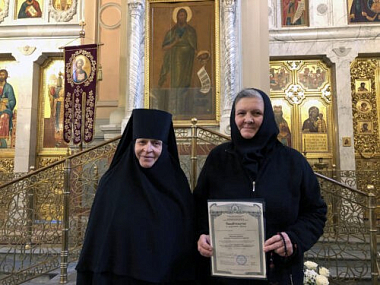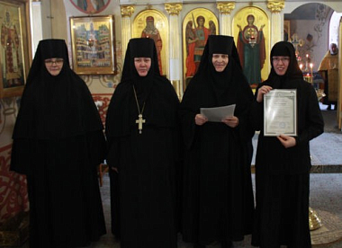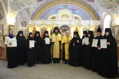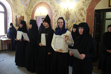 В Крестовоздвиженской обители также был отслужен благодарственный молебен, по окончании которого к собравшимся с поздравительным словом обратилась настоятельница монастыря игумения Екатерина (Чайникова) и вместе с руководителем – монахиней Анувией вручила выпускницам свидетельства.