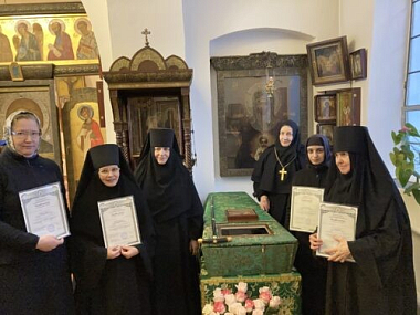 В Серафимо-Знаменском скиту монахиня Анувия (Виноградова) совместно с матушкой настоятельницей – игуменией Иннокентией (Поповой) у мощей преподобной Фамари исповедницы вручила свидетельства выпускницам. Игумения Иннокентия и монахиня Анувия поздравили выпускниц с окончанием курсов, отметив необходимость углублять полученные знания и делиться ими с другими сестрами.