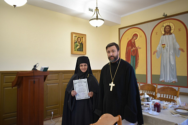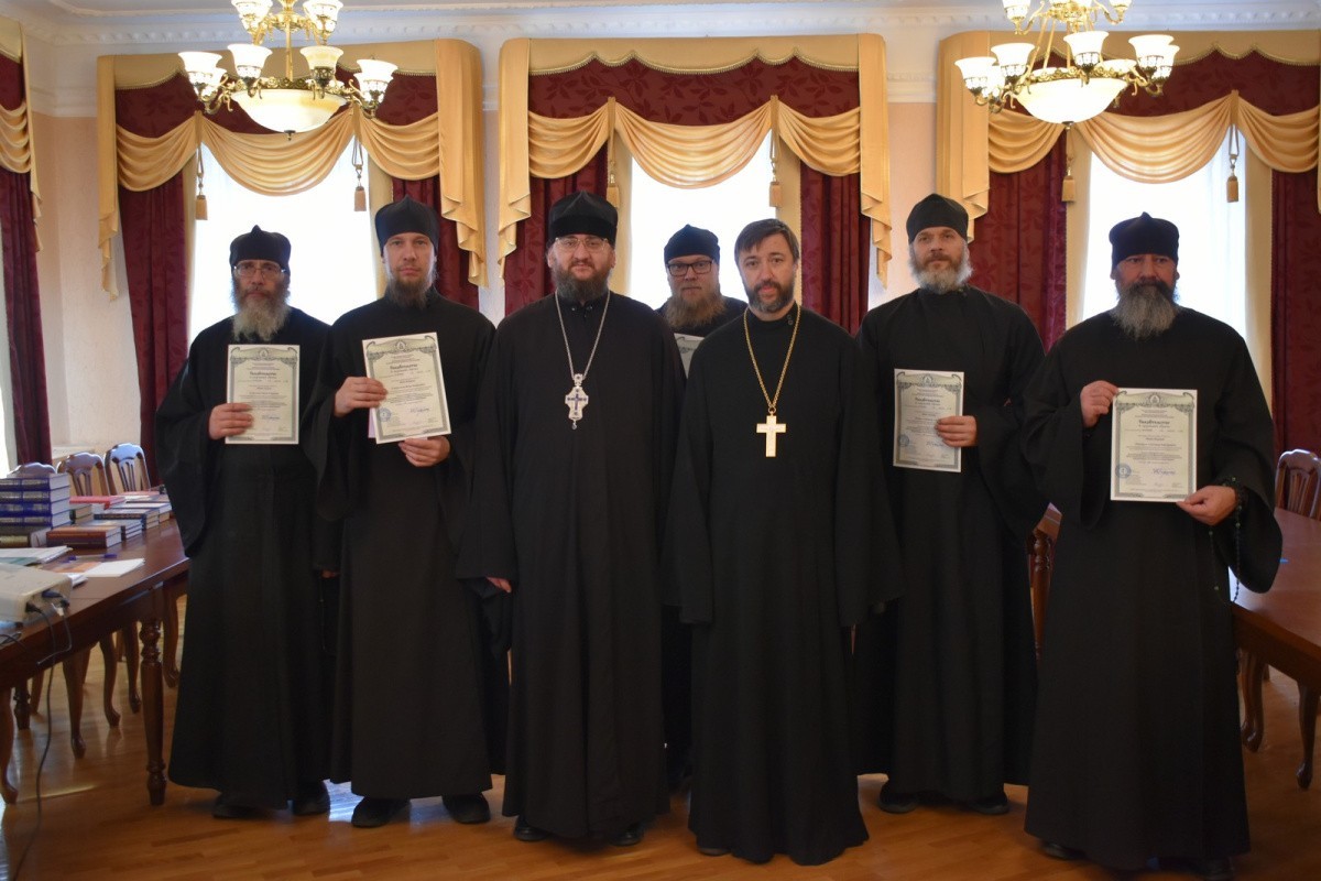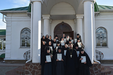 Директор Межъепархиального центра церковных специалистов Курской епархии Русской Православной Церкви, руководитель курсов базовой подготовки в области богословия для монашествующих, иерей Роман Кацап выступил перед выпускниками с приветственным словом, поблагодарил игуменов и игумений, которые помогали осуществить учебный процесс, подчеркнул значимость повышения своего образовательного уровня, поблагодарил преподавателей и учащихся за труды, после чего вручил свидетельства о прохождении курсов 44 выпускникам.