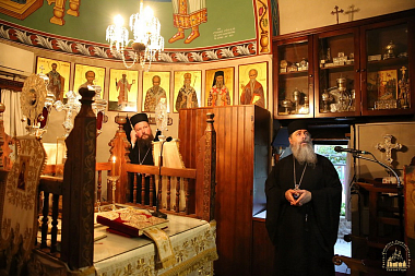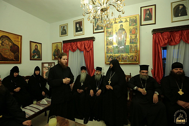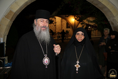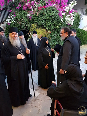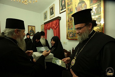 Владыка Арсений передал в дар архиепископу Хризостому Владимирскую икону Божией Матери, посох и изданную Синодальным отделом по монастырям и монашеству книгу «Слово к монашествующим. Проповеди Святейшего Патриарха Кирилла в монастырях» на греческом языке.
