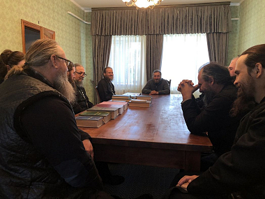 – беседу о цели и задачах реализуемого стандарта базовой богословской подготовки монашествующих с руководством и преподавательским составом курсов, а также с игуменами и игумениями монастырей, чьи насельники предполагаются к обучению на курсах.