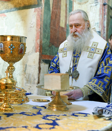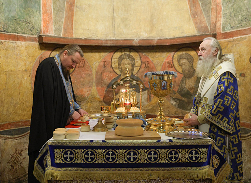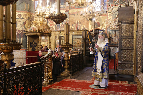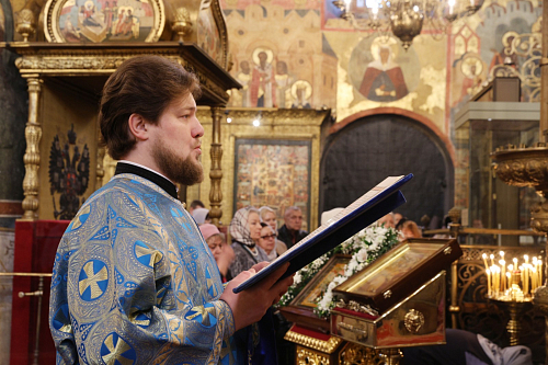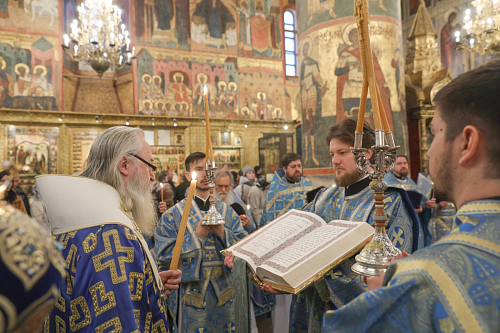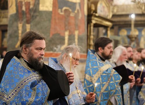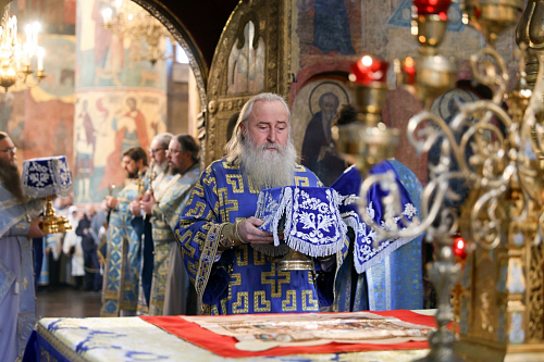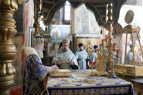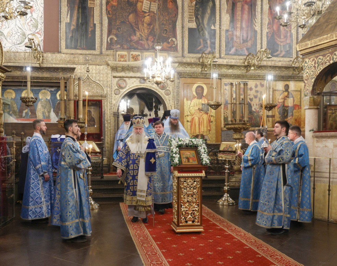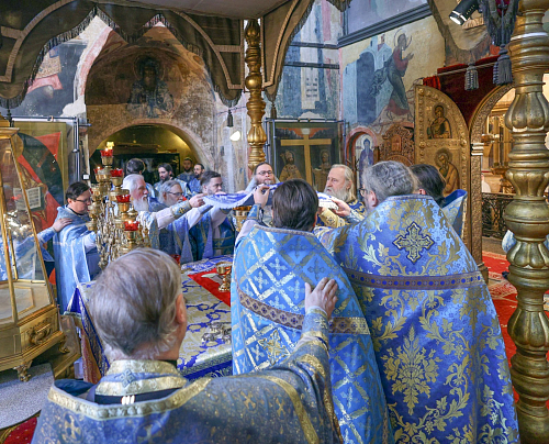 Его Высокопреосвященству сослужили: ризничий Патриаршего Успенского собора и храмов Московского Кремля, настоятель Патриаршего подворья храмов в Зарядье г. Москвы протоиерей Вячеслав Шестаков; заместитель председателя Синодального отдела по монастырям и монашеству, настоятель Саввино-Сторожевского ставропигиального мужского монастыря архимандрит Стефан (Тараканов); наместник Андреевского ставропигиального мужского монастыря игумен Дионисий (Шлёнов); и.о. настоятеля Заиконоспасского ставропигиального мужского монастыря иеромонах Даниил (Константинов); духовенство г. Москвы.