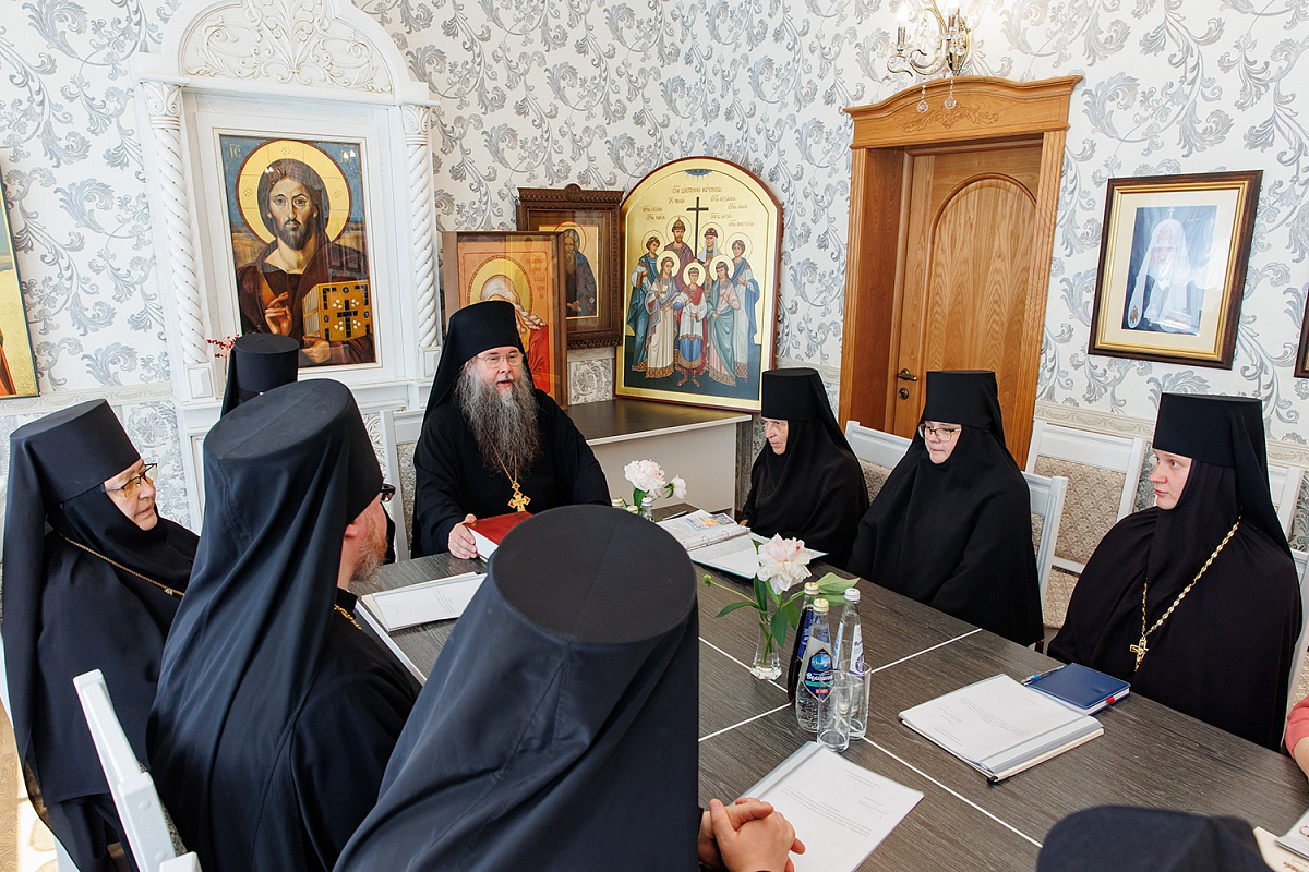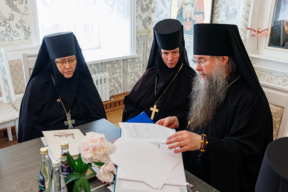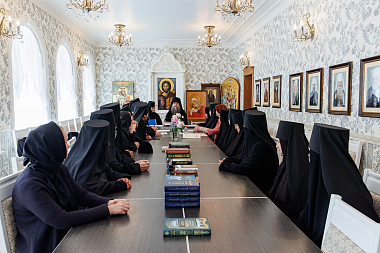 Архимандрит Феофилакт и члены комиссии провели беседу с игумениями и насельницами епархиальных монастырей, руководством и преподавателями курсов. На встрече присутствовали настоятельница женского монастыря в честь Архангела Михаила с. Комаровка Ульяновского района Ульяновской области игумения Магдалина (Митропольская), настоятельница Спасского женского монастыря Ульяновска, заведующая курсами базовой подготовки в области богословия для монашествующих Симбирской епархии игумения Сергия (Вотрина), настоятельница женского монастыря в честь иконы Божией Матери «Знамение» с. Ляховка Майнского района Ульяновской области игумения Клеопатра (Ефремова), председатель отдела по монастырям и монашеству Симбирской епархии игумен Алипий (Кудрин), секретарь Епархиального совета Симбирской епархии протоиерей Илия Кузнецов, личный секретарь правящего архиерея Симбирской епархии иеромонах Иларион (Хроль), секретарь курсов базовой подготовки в области богословия для монашествующих Симбирской епархии иеромонах Савва (Марков).
