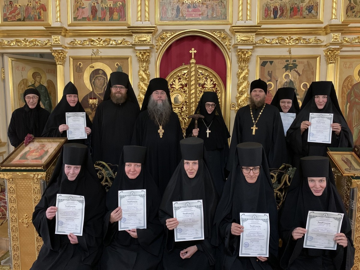 По окончании итогового междисциплинарного зачета в Троицком храме обители всем слушательницам были торжественно вручены Свидетельства Межведомственной комиссии по вопросам образования монашествующих Русской Православной Церкви о прохождении Курсов. Председатель аттестационной комиссии архимандрит Феофилакт поблагодарил руководителя Курсов – игумению Фаину, преподавателей и сестер за ответственное отношение к поручению Святейшего Патриарха Московского и всея Руси Кирилла о повышении богословского образования монашествующих.