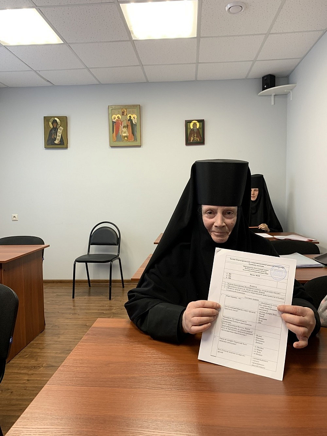 Зачет проводили Руководитель курсов, настоятельница Троице-Одигитриевской ставропигиальной обители – игумения Фаина (Кулешова) и преподаватель курсов и Перервенской духовной семинарии – иеромонах Михаил (Булочев). Члены выездной экспертной группы с удовлетворением отметили довольно глубокие знания слушательниц. Все 9 сестер получили зачёт.