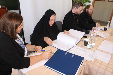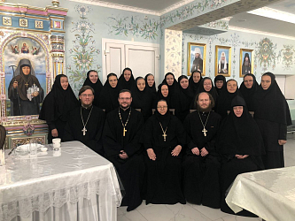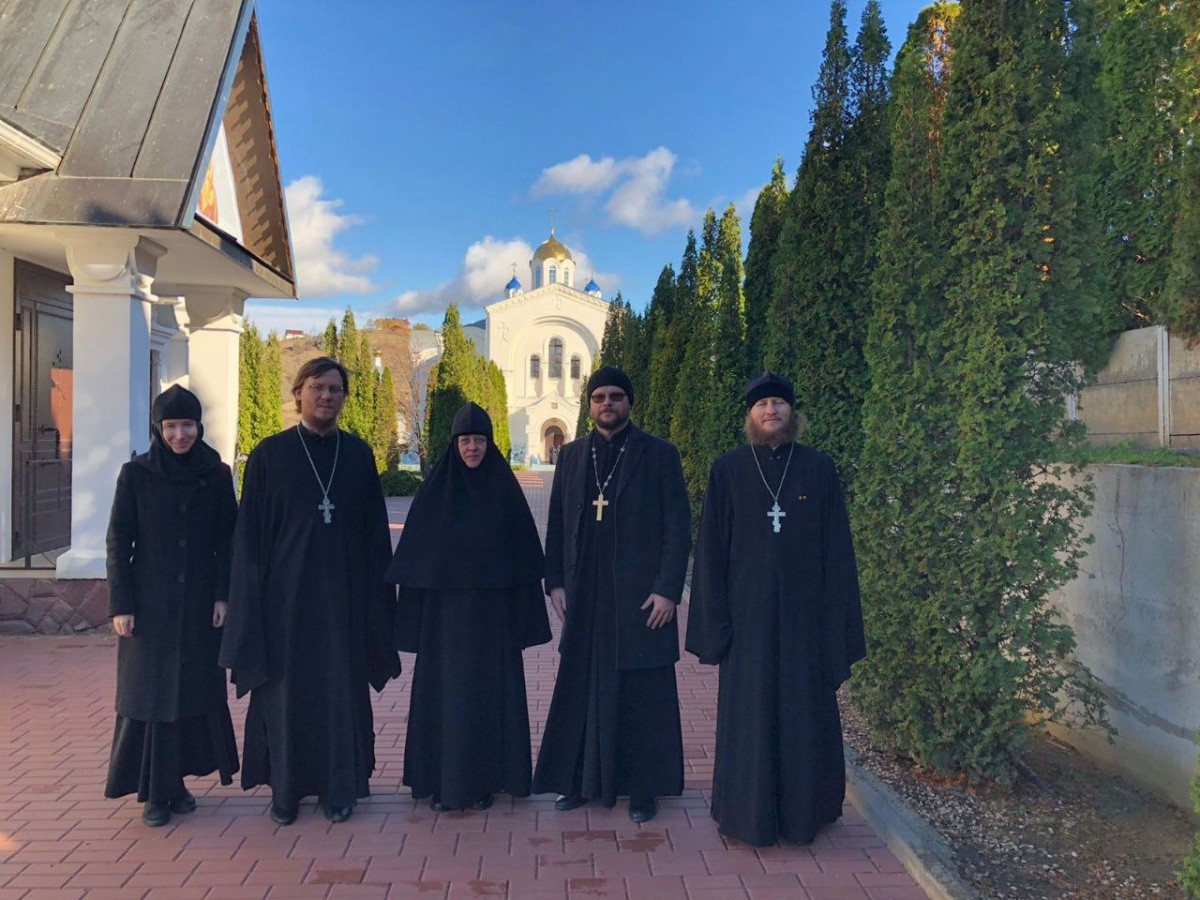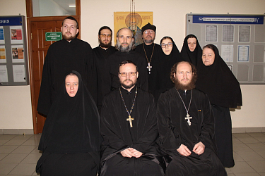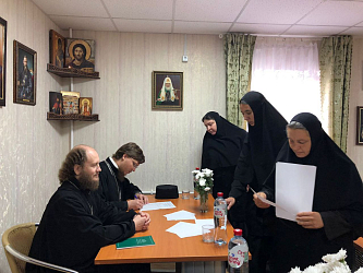 7 ноября члены комиссии приняли зачет, ознакомились с материально-технической базой и библиотечным фондом дополнительной учебной площадки и встретились с настоятельницей игуменией Георгией (Боровик), директором Центра иереем Вячеславом Патриным и преподавателем курсов иереем Виктором Вытновым в Усть-Медведицком Спасо-Преображенском женском монастыре.